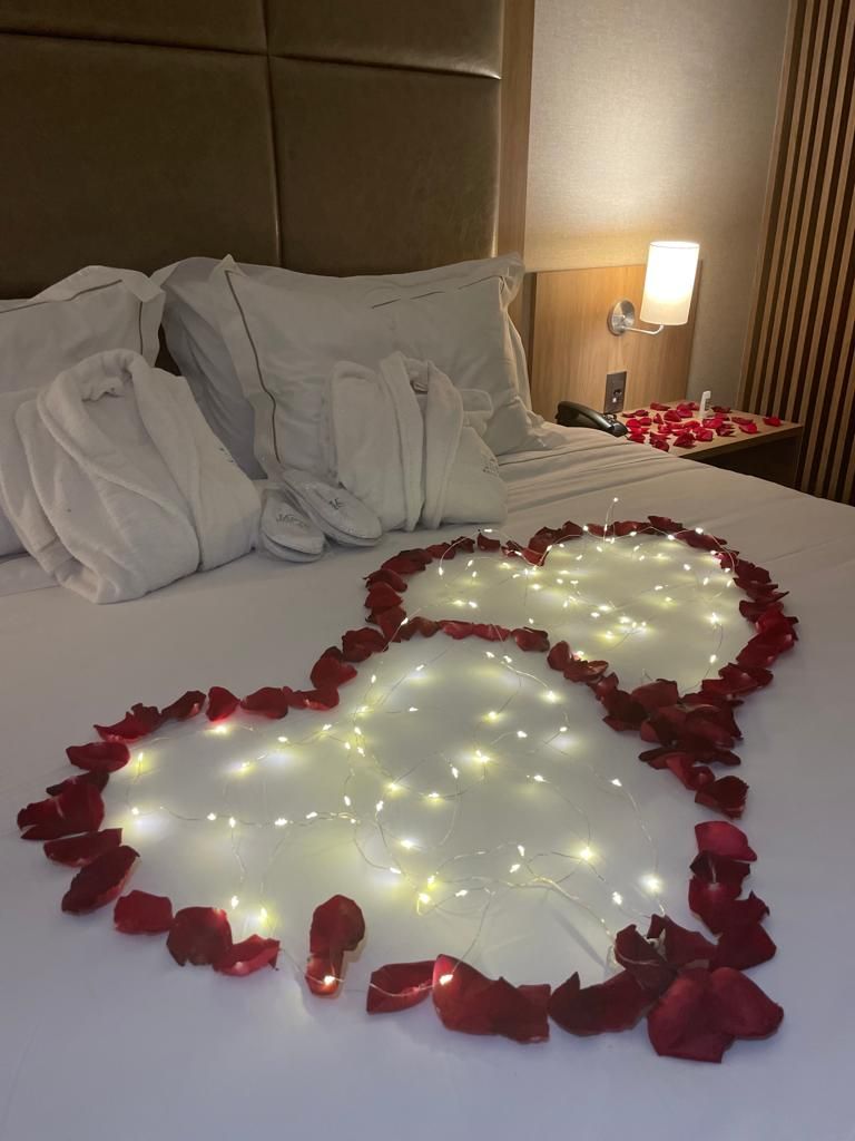 O pacote romântico conta com espumante nacional, morangos com ganache de chocolate, lindas pétalas de rosas pelo quarto e foto do casal.